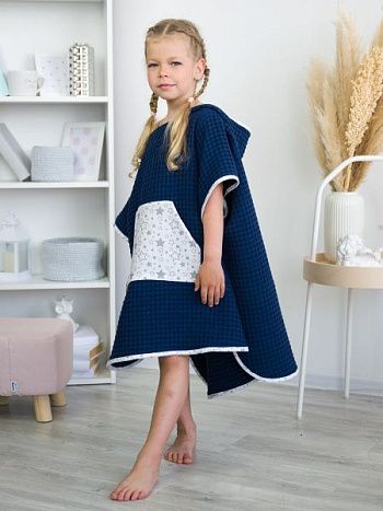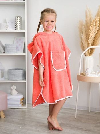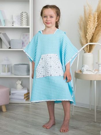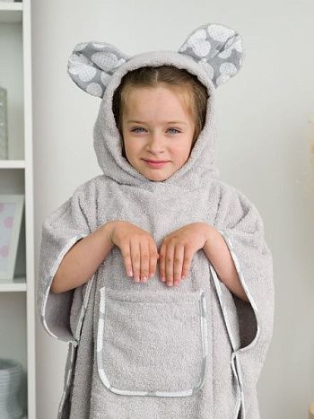 Пончо имеют стандартный размер 60 х 120 см. Накидка с капюшоном подходит для детей дошкольного возраста. Модели различаются разнообразной окраской, среди которых преобладают пастельные оттенки. Многие из них украшены нежной вышивкой. Основное предназначение пончо – накидывание на ребенка после купания. Одежда легко надевается через голову. Отсутствие застежек и завязок открывает простор для движений. Дети могут резвиться после купания, а капюшон защищает от сквозняков и переохлаждения.